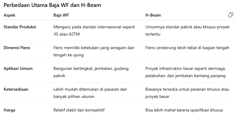Baik baja WF maupun H-Beam sama-sama memiliki peran penting dalam dunia konstruksi. Perbedaan pada dimensi, standar produksi, dan aplikasi membuat pemilihan material harus disesuaikan dengan kebutuhan struktur dan anggaran proyek. Dengan memahami perbedaan keduanya, kontraktor dapat mengambil keputusan yang tepat untuk memastikan kekuatan dan efisiensi konstruksi.