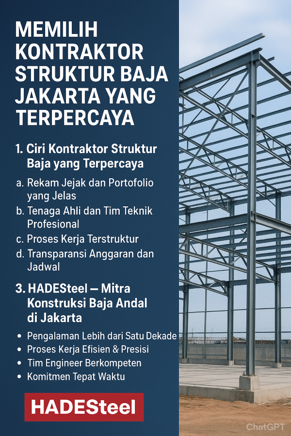 Memilih kontraktor struktur baja di Jakarta bukan hanya soal harga, tetapi juga kepercayaan dan kualitas hasil kerja. HADESteel hadir sebagai jawaban bagi kebutuhan konstruksi baja yang profesional, presisi, dan tahan lama. Hubungi HADESteel untuk mewujudkan proyek baja Anda dengan hasil terbaik.