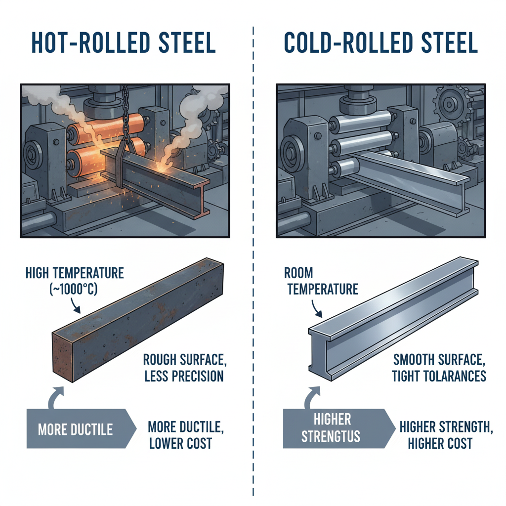 Baja Hot-Rolled dibuat dengan pemanasan logam hingga suhu tinggi (lebih dari 900°C) lalu dibentuk sesuai ukuran yang diinginkan. Sementara Cold-Rolled adalah baja hot-rolled yang diproses kembali pada suhu ruang untuk mendapatkan hasil akhir yang lebih halus dan presisi tinggi.